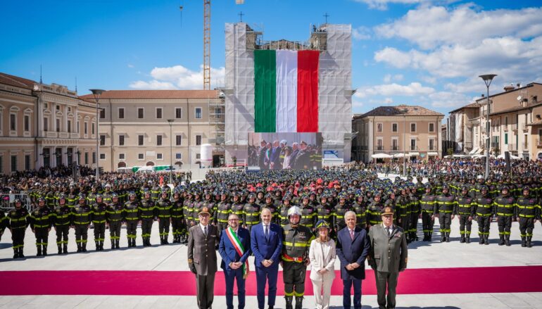 LE REAZIONI. Entusiasmo e gratitudine per Liris e Sigismondi. «È un momento molto importante e toccante, per la città, c’è un legame profondo di gratitudine per i vigili del fuoco che, nei momenti difficili, ci sono sempre stati e sempre ci saranno», sottolinea Liris. «I Vigili del fuoco sono cittadini onorari dell’Aquila, dopo essere stati angeli custodi nella drammatica fase del terremoto. Hanno rappresentato la prima presenza dello Stato nel pieno dell’emergenza. A loro ci aggrappammo con tutte le forze. Ed è bello vederli qui ora, nel segno del 99, del loro giuramento e numero simbolo della città», aggiunge Sigismondi. Tra i presenti anche il Commissario Straordinario per il sisma 2016, Guido Castelli. «La professionalità, il valore e lo spirito di servizio dei nostri Vigili del Fuoco sono un patrimonio riconosciuto tanto dalle istituzioni quanto dai cittadini», valuta. «Ciò è particolarmente vero qui a L’Aquila, dove il lavoro encomiabile e senza sosta svolto in occasione del sisma del 2009 ha creato un legame profondo tra il Corpo e la città. I Vigili del Fuoco hanno poi svolto un servizio altrettanto fondamentale in occasione della drammatica sequenza sismica avvenuta nell’Appennino centrale tra il 2016 e il 2017 e, in quella occasione, ho potuto personalmente constatare la loro dedizione e le capacità. Tra i 34 interventi attualmente in corso per la riparazione o ricostruzione di caserme nel cratere 2016», rileva, «due, in particolare, riguardano anche i Vigili del Fuoco. Si tratta dei lavori di manutenzione straordinaria delle caserme Teramo e di Camerino, che speriamo di restituire quanto prima al Corpo così da consentire al suo personale di operare in strutture più moderne e sicure. Il lavoro di ricostruzione e rinascita prosegue, sapendo di poter contare sempre su chi è pronto a intervenire nei casi di emergenza». A impreziosire lo spettacolo anche il volo radente di un elicottero in dotazione.