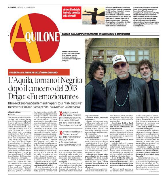 Che rumore fa la felicità? Chiedetelo a 1.500 fortunati che stasera si ritroveranno, biglietto alla mano, agli ingressi della Scalinata di San Bernardino per assistere a uno dei concerti – solo quattro al momento: oltre all’Aquila, Mesagne (Br), Agerola (Na) e Bard (Ao) – in versione minimal. Ecco “Talk & Live ’25” del Negrita Acoustic Trio, formato dai componenti Paolo “Pau” Bruni, Enrico “Drigo” Salvi e Cesare “Mac” Petricich, con la partecipazione del giornalista Gianmaurizio Foderaro e il supporto ritmico del batterista Cristiano Della Pellegrina. Un appuntamento promosso dalla Società Aquilana dei Concerti Bonaventura Barattelli nell’ambito dei Cantieri dell’Immaginario del Comune dell’Aquila. Dunque, è tempo di nuova musica per i Negritache a sette anni dal loro ultimo lavoro sono tornati a proporre i loro suoni e le loro parole con l’ultimo album – l’undicesimo – Canzoni per anni spietati. Nove brani che rappresentano un atto di libertà creativa e di pensiero con uno sguardo critico e profondo su una contemporaneità sempre più omologata. I Negrita hanno ancora parecchie cose importanti da dire, e le racconteranno in una serata acustica in trio, confrontandosi con Foderaro, voce storica della radio italiana e responsabile di Isoradio. Parole e musica per raccontare trent’anni di rock senza aver paura di dire le cose come stanno, con energia e pensiero, l’irruenza della gioventù ma anche lo sguardo d’insieme della maturità. Un racconto che attraversa una carriera ancora lucida nel riflettere sulla nostra società e sul nostro mondo: un occhio a Dylan e un altro al rock and roll, ma anche l’occasione per riascoltare il sound energico e profondo della band. Uno spettacolo a misura d’uomo: lo spiega Drigo Salvi parlando alla vigilia.