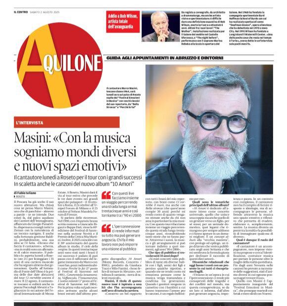 Il 22 agosto, il cantautore toscano si esibirà anche in piazza Duca degli Abruzzi a Tagliacozzo in occasione del Festival Internazionale di Mezza Estate. A Roseto, Masini darà il via al tour estivo che precede le tre date evento nei grandi spazi dei palasport – il 18 ottobre a Roma, il 24 ottobre all’Unipol Forum di Milano e il 25 ottobre al Nelson Mandela Forum di Firenze. Si parlava delle ricorrenze. Nel 1990, con Disperato, brano scritto insieme a Giancarlo Bigazzi e Beppe Dati, vinse la 40ª edizione del Festival di Sanremo nella sezione Novità e il Premio della Critica Mia Martini. Inoltre, il 2025 coincide con il 30º anniversario del quarto album in studio, Il cielo della vergine.