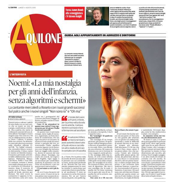 Noemi torna a calcare i palchi di tutta Italia con un tour estivo che sa essere un mix di energia, condivisione e intimità. Una scaletta che mette in evidenza le canzoni del suo ultimo album Nostalgia e i nuovi singoli come Non sono io e Oh ma, in collaborazione con Rocco Hunt. L’album, il settimo della sua carriera, ha debuttato come più alta nuova entrata nella classifica ufficiale Fimi/Gfk. Tra ballad romantiche, atmosfere blues e sonorità elettroniche, il disco mette in mostra un’identità musicale matura e personale, arricchita dalle collaborazioni con Colapesce, Mahmood, Blanco, Carl Brave, Neffa e Tony Effe. La cantante romana è attesa mercoledì a Roseto per la serata conclusiva di Emozioni in musica, dopo i concerti di Marco Masini (Lunedì 4) e Setak (martedì 5). Nei mesi scorsi, la cantautrice è apparsa in format televisivi, serie ed è stata anche tra i protagonisti del Concerto del Primo Maggio di Roma, sul palco anche in veste di conduttrice.