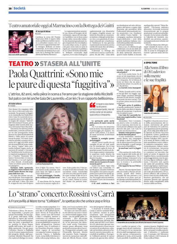 Due donne che scappano dalle loro vite e si ritrovano sulla stessa strada. Da qui parte Le fuggitive, la commedia con Paola Quattrini e Gaia De Laurentiis in scena questa sera (ore 20.30) all’Aula magna del campus “Saliceti” dell’Università di Teramo per la stagione della Società della musica e del teatro “Primo Riccitelli”. Una storia che alterna ironia e malinconia, costruita sull’incontro tra due protagoniste molto diverse ma unite dal desiderio di libertà e dalla paura di essere messe da parte. A 82 anni, Quattrini ha esordito a quattro nel cinema ed è oggi una delle attrici più riconoscibili del teatro italiano, storica “regina” della commedia brillante legata anche ai successi di Garinei e Giovannini. Parallelamente ha attraversato repertori impegnativi (da Sartre a Pasolini, Tennessee Williams e Dostoevskij) e il cinema, dai Vanzina a I No Spik Inglish e Le finte bionde, rivendicando: «Sono un’attrice: posso far ridere e piangere».