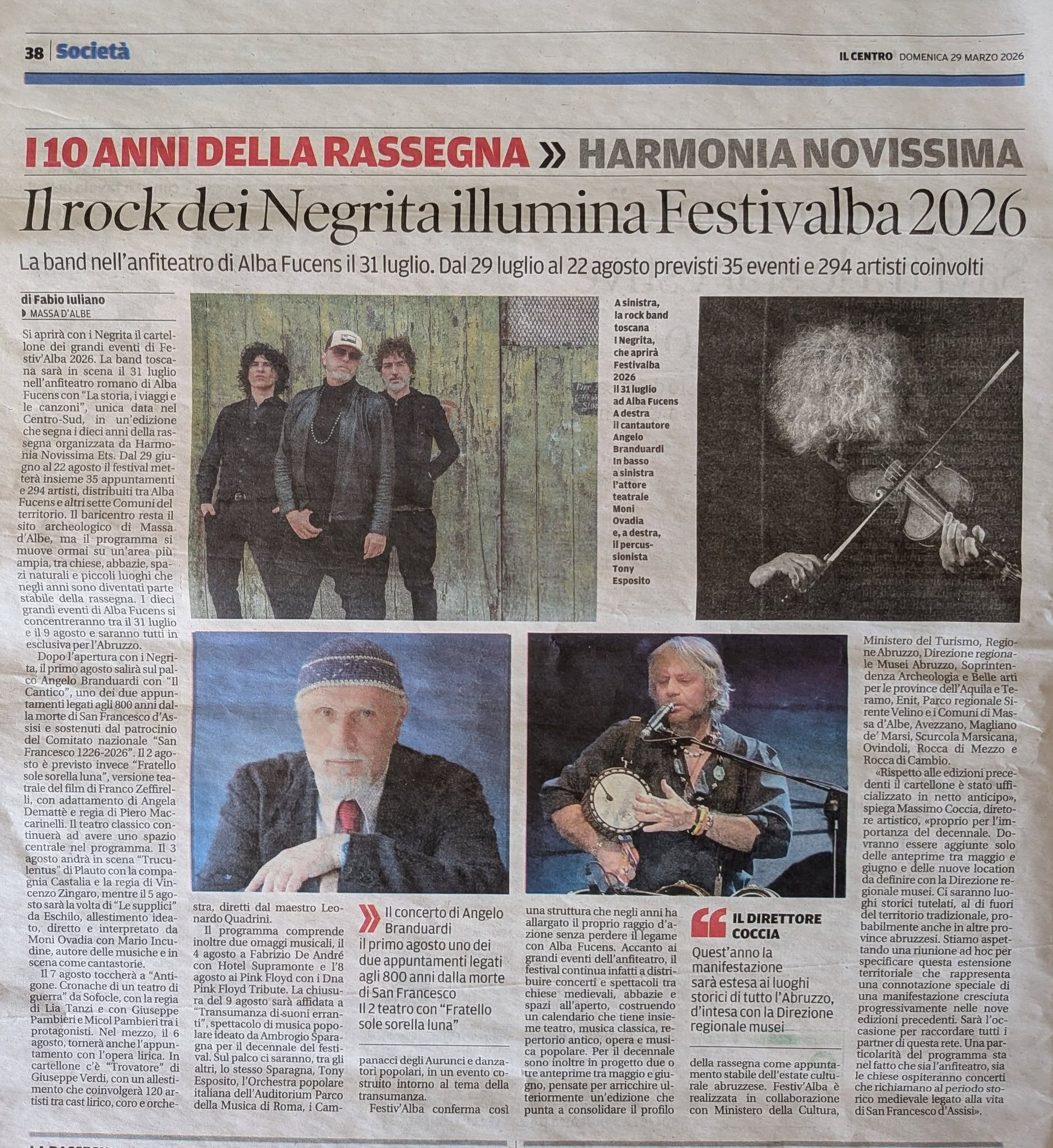 Saranno i Negrita ad aprire il cartellone dei grandi eventi di Festiv’Alba 2026 nell’Anfiteatro romano di Alba Fucens. La band toscana sarà sul palco il 31 luglio con “La storia, i viaggi e le canzoni”, appuntamento annunciato come unica data nel Centro-Sud. È uno dei titoli di punta della decima edizione della rassegna organizzata da Harmonia Novissima Ets, in programma dal 29 giugno al 22 agosto.