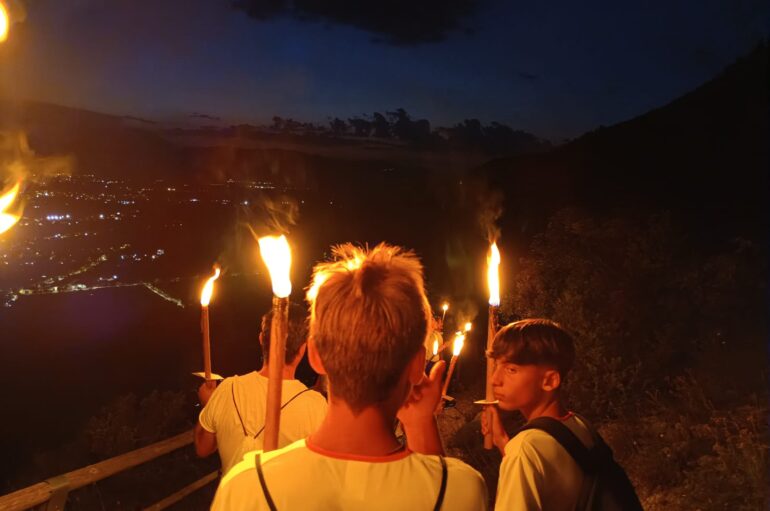 Quando le due file di bambini e runner veterani raggiungono la chiesa di Santa Maria di Centurelli a Caporciano (L’Aquila) al seguito della fiaccola di Celestino, non manca ormai molto al tramonto. I più piccoli si fanno strada tra altre